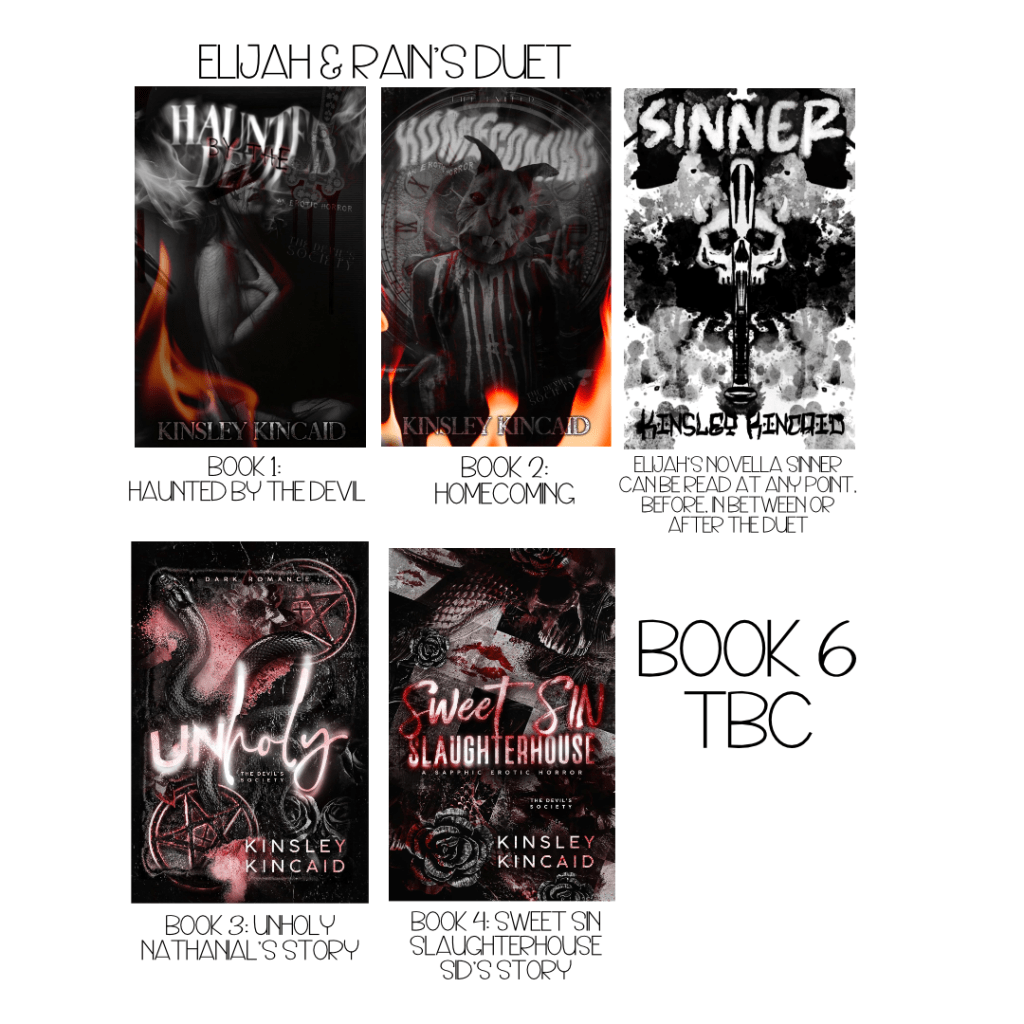 The first two books, Haunted By The Devil and Homecoming, are Rain & Elijah’s duet. Sinner is Elijah’s novella and can be read at any point before, in between or after the duet. Unholy is Elijah’s dad, Nathanial’s book, and Sweet Sin Slaughterhouse is Elijah’s daughter Sid’s book. Sweet Sin is a standalone in that you don’t need to read the other books to follow the storyline, but you will understand the characters better if you read the other books. You will also gain a deeper understanding of the secret society.