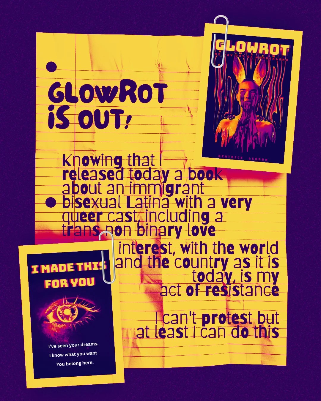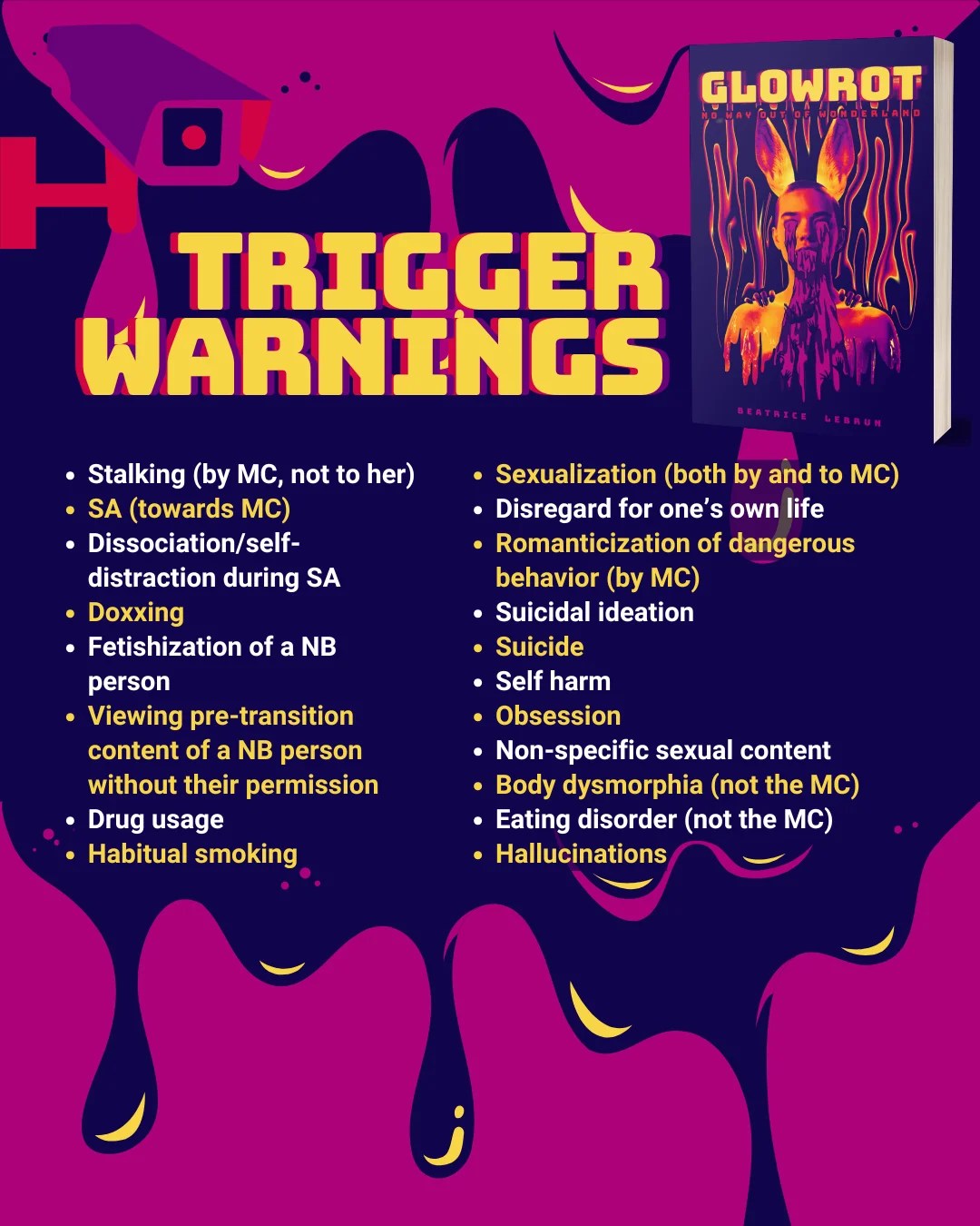 Beatrice Lebrun is an author and illustrator who is obsessed with emotional horror, queer longing and the quiet devastation of being alive. Glowrot is her debut novel in English.
