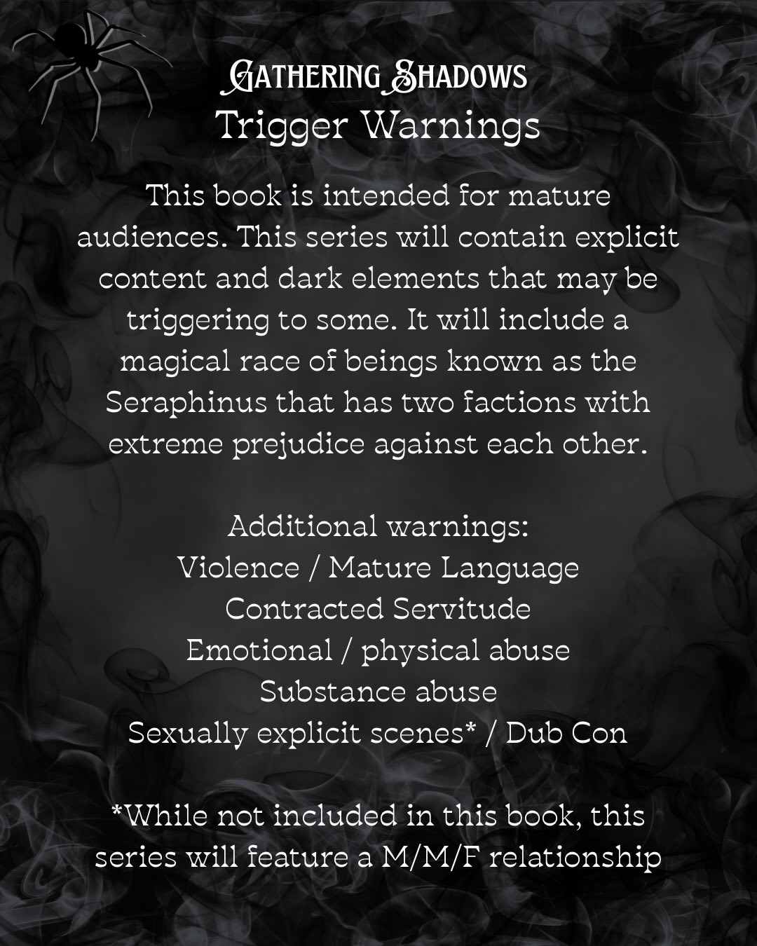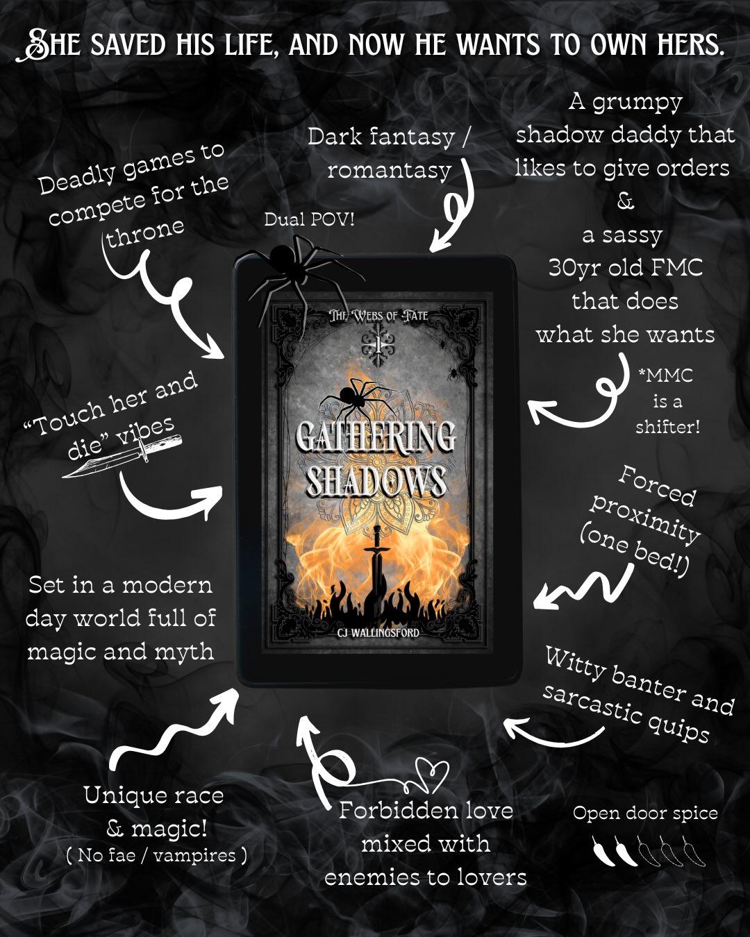 CJ Wallingsford writes dark, romantic fantasy that intertwines to create gripping tales that delve deep into the complexities of flawed characters. Gathering Shadows is the first book in the Webs of Fate series, and there are more to come.