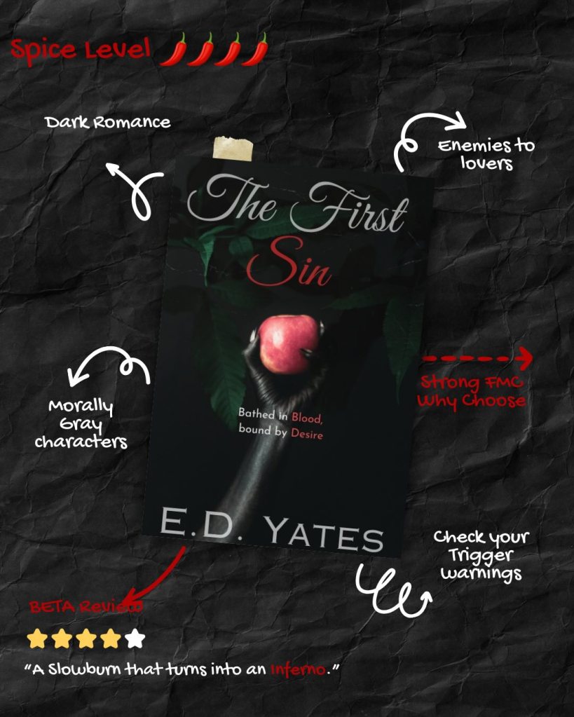 The First Sin is the debut book by author E.D. Yates. I found this author through my “Supporting Indie Authors” post, and when I saw the graphics, I knew it would be one I wanted to add to my TBR. Fortunately for me, I won E.D Yates’ giveaway for a paperback copy of her book and a bookmark. I will elaborate on the giveaway further down. So, what is The First Sin?